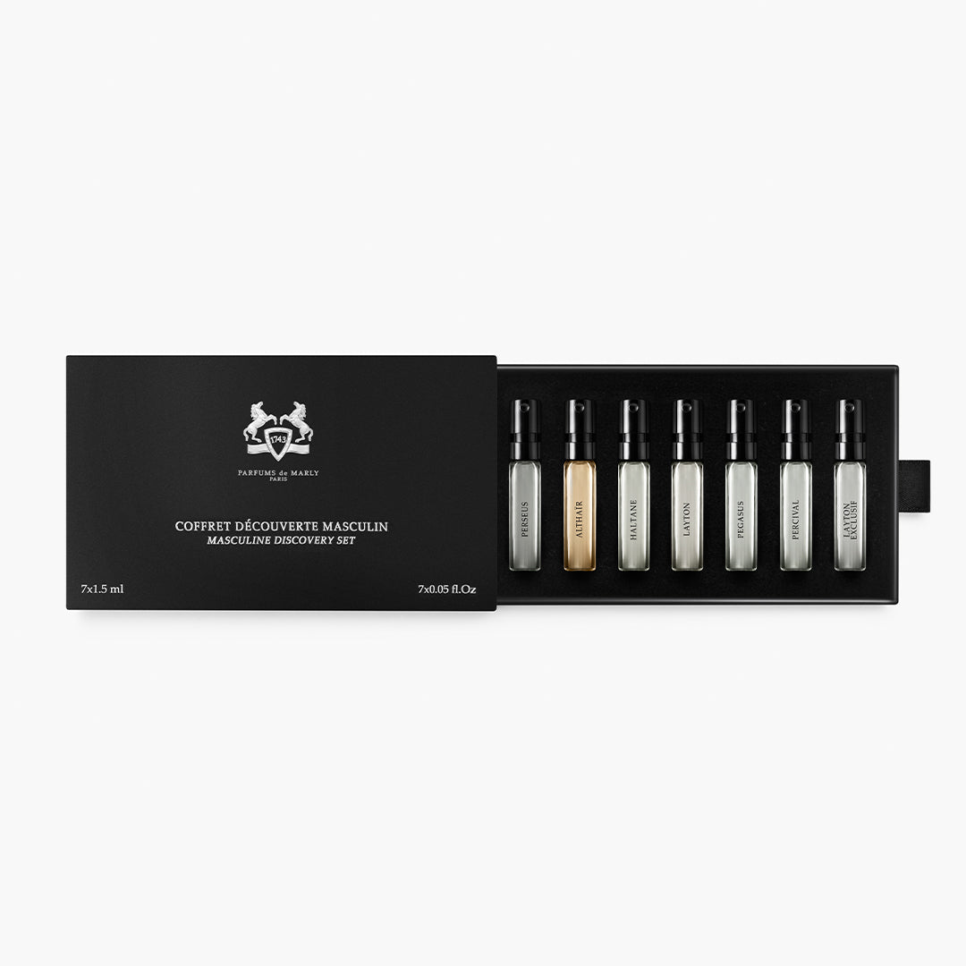 A curated collection of elegant masculinity. Discover and explore the Parfums de Marly masculine range of olfactory narratives through a bespoke selection of seven 1.5ml fragrances. Providing a unique scent for every occasion, day or night, the set features bold and subtle elegance via masculine eau de parfum including the Maison's iconic fragrances: Perseus, Althaïr, Haltane, Layton, Pegasus, Percival and Layton Exclusif.