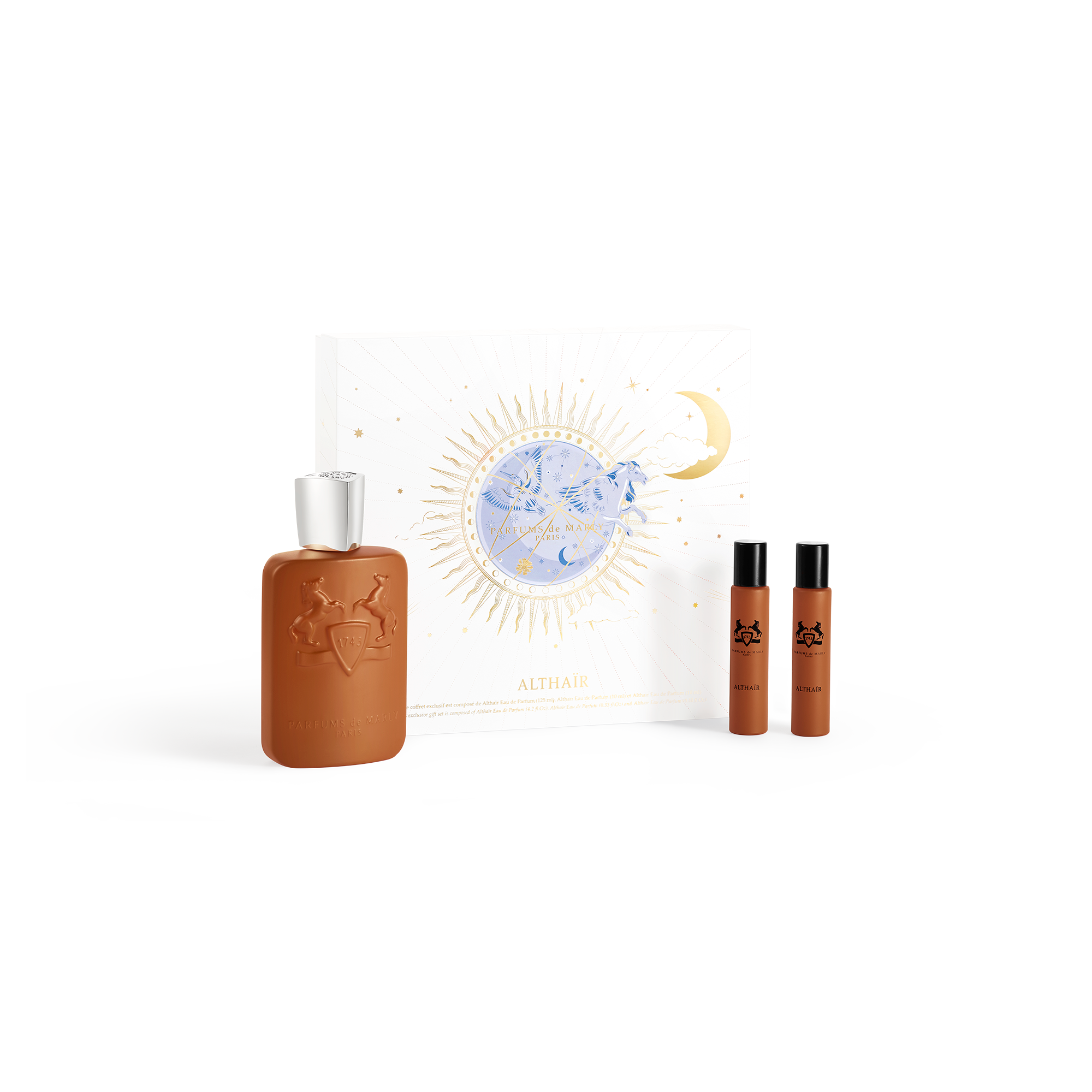 The Maison invites you to experience an enchanting spectacle at the heart of the Château de Marly with this exclusive Althaïr gift set. Elegant, generous, and charismatic, Althaïr blends the sweetness of vanilla, the indulgence of praline, and the brightness of orange blossom. The set includes Althaïr Eau de parfum 125ml and two 10ml travel sizes.
