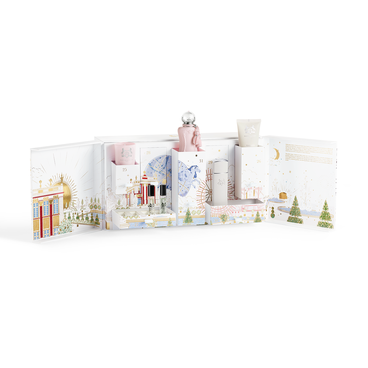 True to the tradition of the Sun King, who was known for offering precious gifts to celebrate the New Year, Parfums de Marly invites you to experience a magical spectacle, Beyond Compare. This Countdown Calendar, composed of 12 gifts across 7 drawers, unveils an enchanting world where each discovery brings a moment of wonder. From the famous Coronelli Celestial Globe, housed in one of the twelve pavilions, to the Marly machine, a series of events is set in motion to awaken and illuminate the estate.