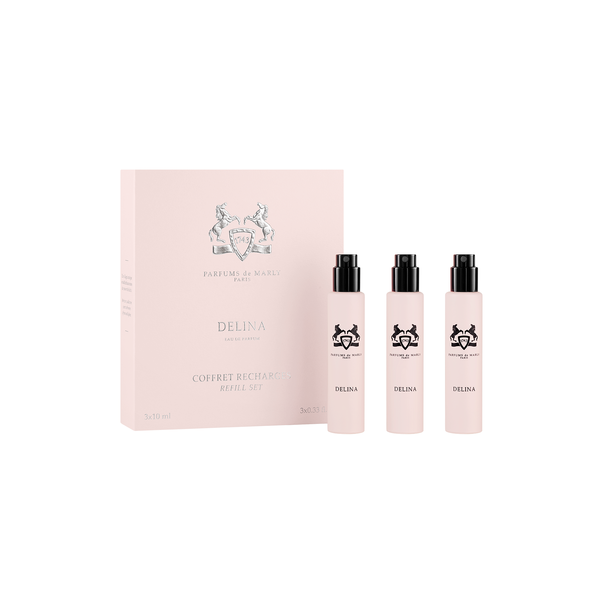 The Delina Refill Set elegantly extends the art of perfumery. It includes three 10 ml refills, perfectly designed for the Parfums de Marly Travel Case. A creation that remains true to the Maison’s playful and distinctive spirit.