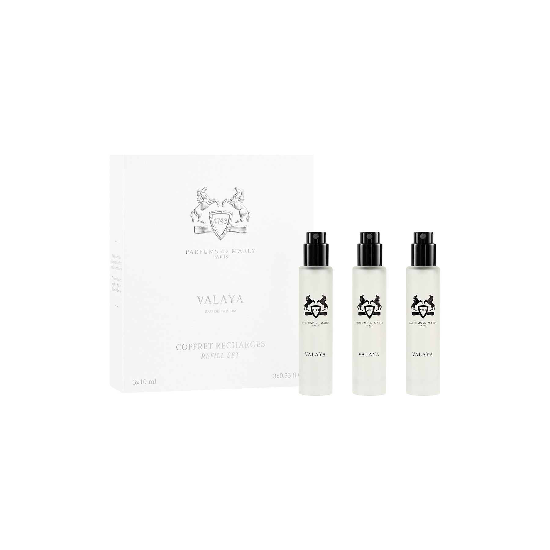 The Valaya Refill Set elegantly extends the art of perfumery. It includes three 10 ml refills, perfectly designed for the Parfums de Marly Travel Case. A creation that remains true to the Maison’s playful and distinctive spirit.